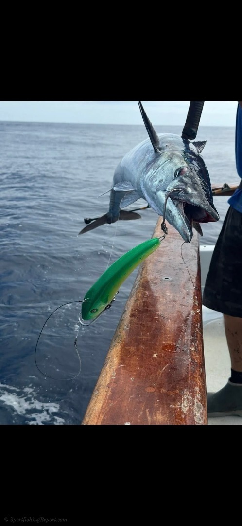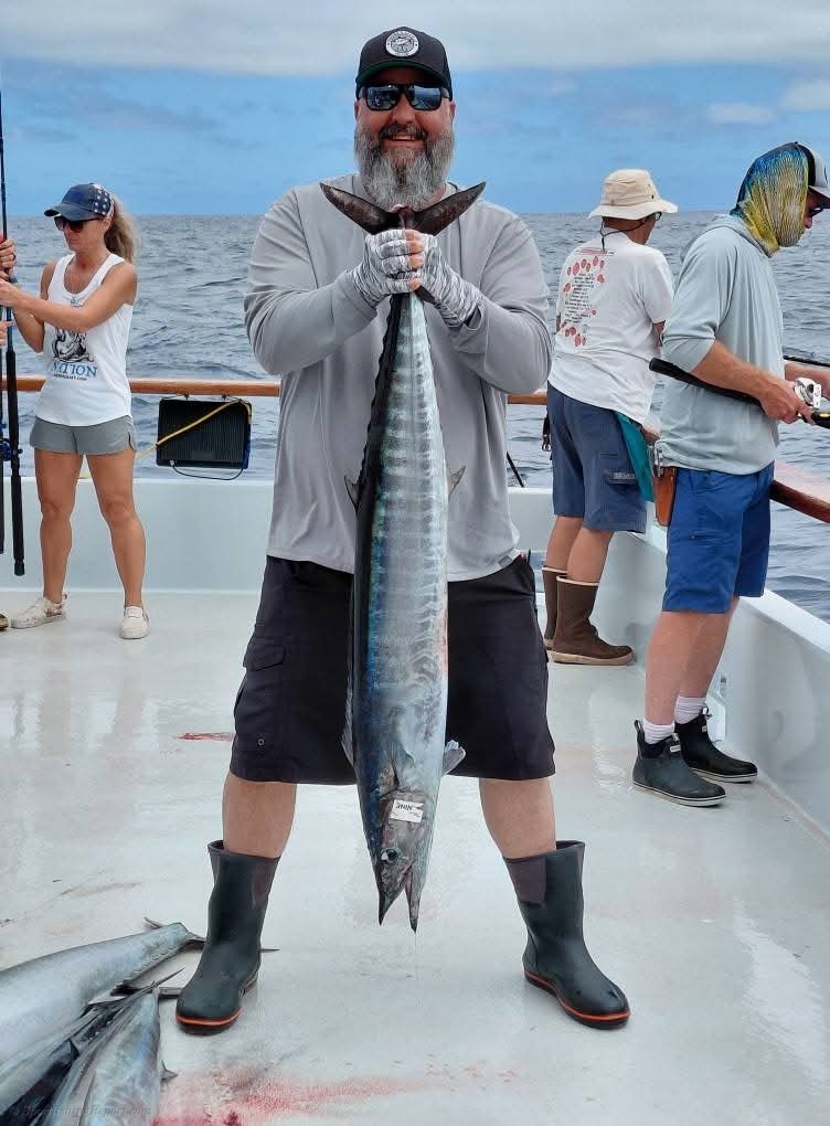 We started the morning dropping anchor and immediately putting some big Yellowfin Tuna (over 100 lbs!) on deck. After that, we switched gears to Wahoo. While they weren't exactly jumping on the troll, we patiently picked away at them one by one. Mission accomplished: Everyone onboard landed a Wahoo, including some folks celebrating their very first one!